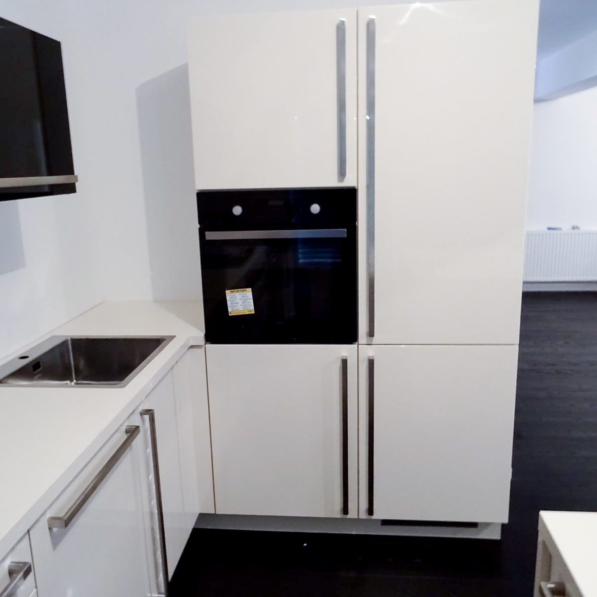 Oblikovna rdeča nit te elegantne monokromatske kuhinje dosledno predstavljata dva elementa – ročaji in nerjavečega jekla in površine visokega sijaja. Inox ročaji nadgradijo izgled volumensko izredno minimalistične strukture kuhinje.