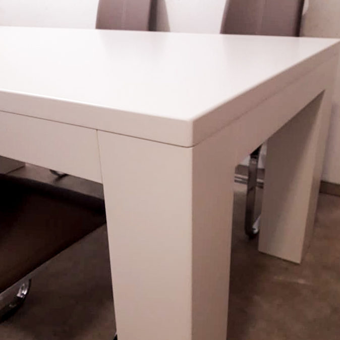 Po naročilu smo izdelali masivno leseno mizo iz oplemenitenega iverala bele mat barve. Posebnost te mize so masivne noge, ki omogočajo prenašanje večjega bremena. Za premoščanje večjega razpona med eno in drugo mizo smo dodali horizontalni letvi, ki poleg masivnih nog, dodajo k občutku masive.