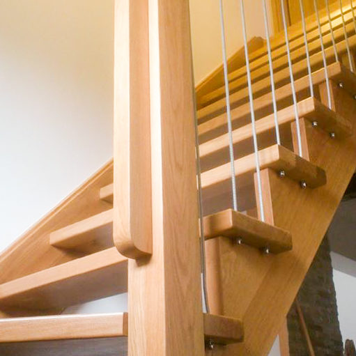 Lesene masivne stopnice iz hrastovega lesa so v celoti izdelane v naši mizarski delavnici. Posebnost teh lesenih stopnic je ograja, ki je narejena iz jeklene vrvi – nerjaveče jeklo.
