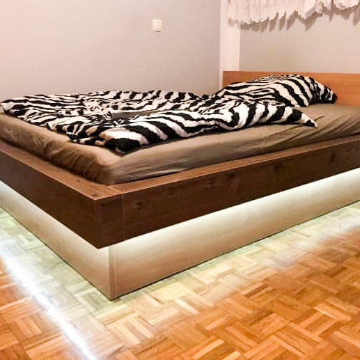 Najrajši imamo projekte, pri katerih lahko uporabimo vse svoje znanje in dolgoletne izkušnje ter kreativnost. In postelja z dodatno led ambientalno osvetlitvijo je zagotovo eden od bolj zanimivih izdelkov. Po željah naročnika smo zasnovali in izdelali ta unikaten mizarski izdelek.