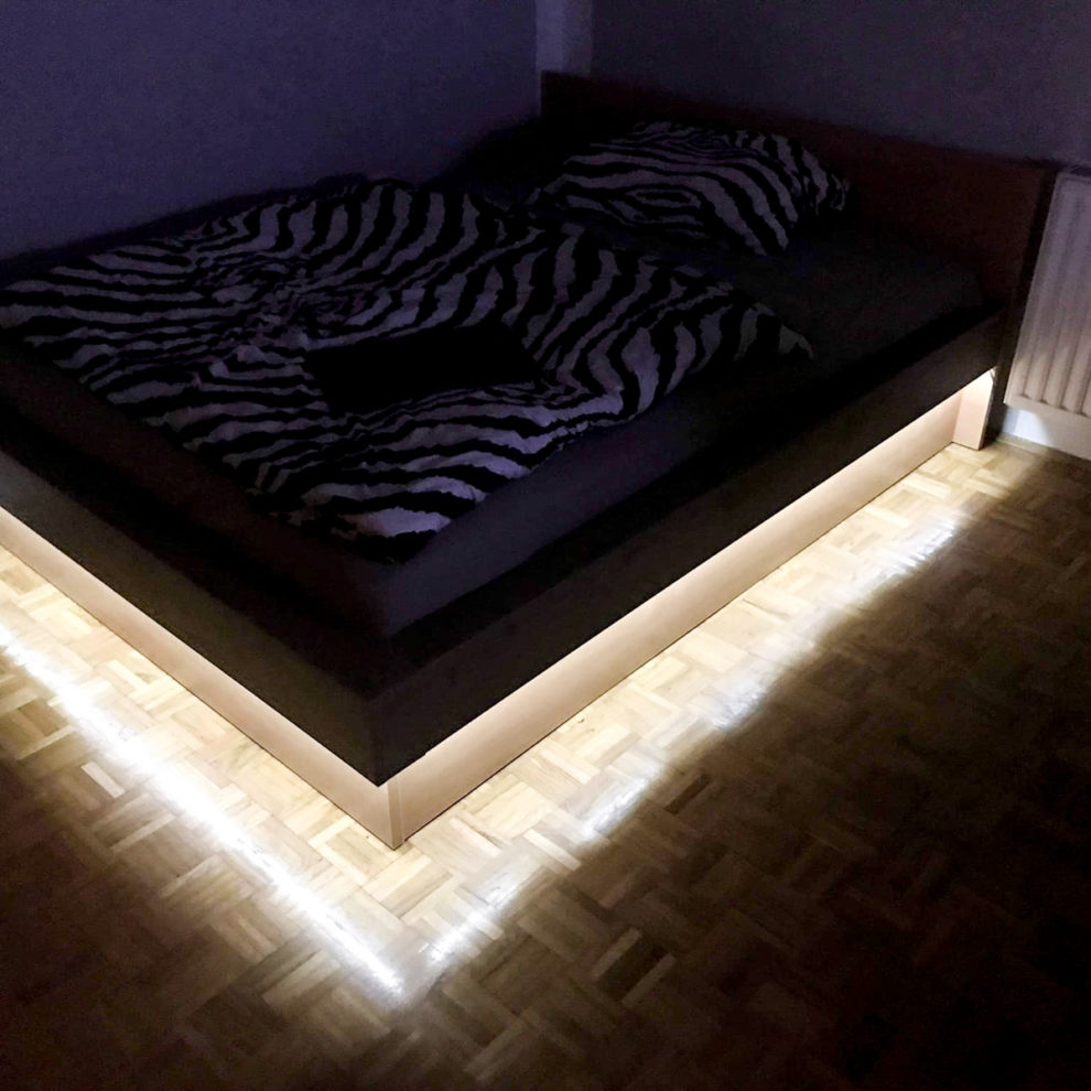 Postelja z dodatno led osvetlitvijo je zanimiva predvsem zaradi detajla, ki smo ga morali razviti posebej za ta izdelek – izziv je bil montaža let traku na skrito površino pod posteljo. In glede na fotografije končnega efekta izdelka, se lahko strinjamo, da je nam je uspelo.