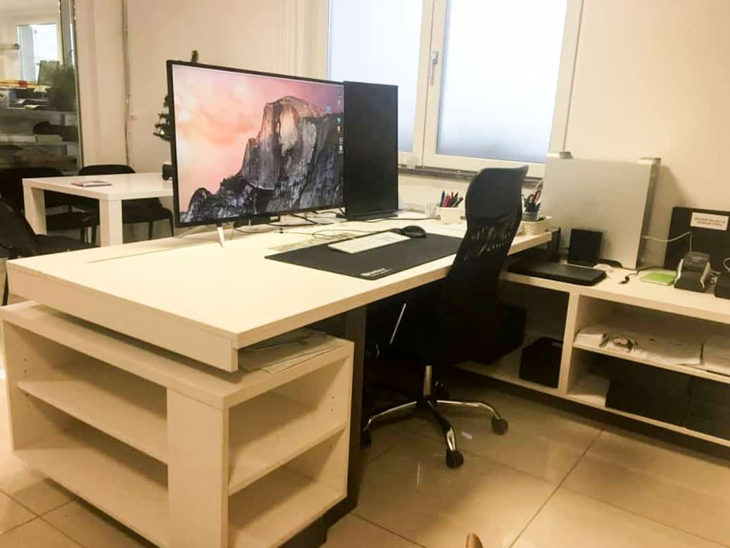 Po meri izdelana pisarniška miza ima vse elemente prilagojene individualnim potrebam naročnika. Veliko pozornosti smo namenili stabilnosti, saj sta na mizi postavljena dva velika in težka zaslona, ki se med delom ne smeta zibati ali vibrirati.